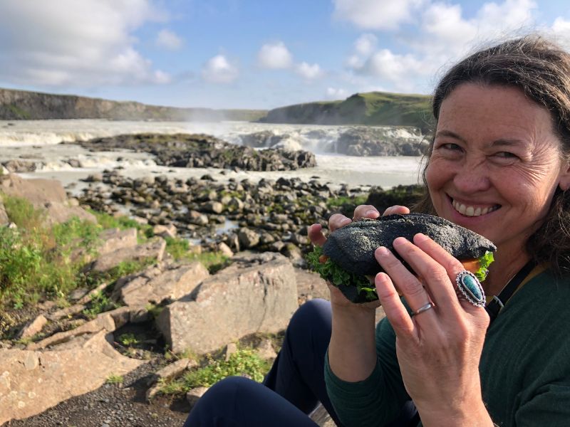 We drove across long expanses of flat lava-flow, now tentatively covered by tenacious grasses and plants trying to build topsoil before the next eruptions, then up into those black volcanic hills and narrow valleys to the edge of glaciers. Strolled through sheep farms, atop spongy moss hilltops reminiscent of Alaska tundra, and along beaches of fine black sand. Picnicked beside powerful waterfalls (no need for pretend waterfalls here!) enjoying smoked salmon & egg on dark lava bread. Everywhere we felt alive, rejuvenated, in harmony and at Peace.