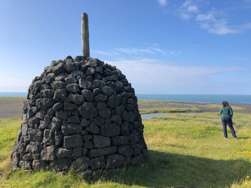 Today we finally turned off the main tourist road and stumbled across Urriðafoss, the country’s most voluminous falls that we had all to ourselves while munching on more smoked salmon lava bread sandwiches. After many farmland gravel roads we discovered an historic Loftstaðahóll fishing cairn (to show fishermen where to come back to land) after trudging through a random field almost out to the seashore. Other visitors have dramatically described it as “the best pile of rocks with a stick in it that I’ve ever seen!” and “Who would have thought a pile of rocks with a stick would be so mesmerizing!”