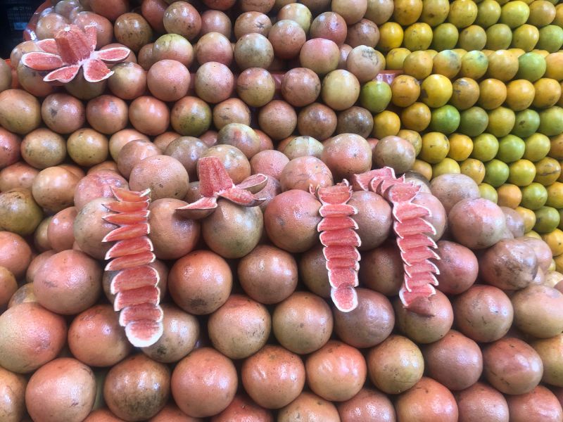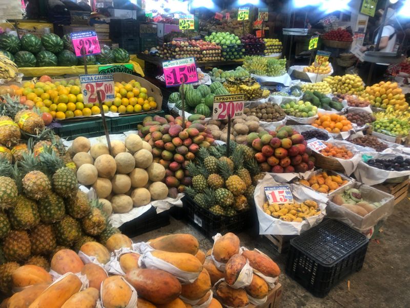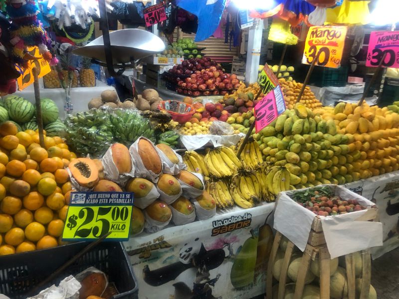 Note: When they use a $ sign, it's actually referring to Mexican pesos. $1 US = 18 pesos. So the $25/kilo fruit below (not sure if it's the oranges or the papaya) is actually $1.38/kilogram, or $0.63 per pound. I suppose that low price explains the mysterious proclamation above it: "How wonderful that this nightmare is over!"