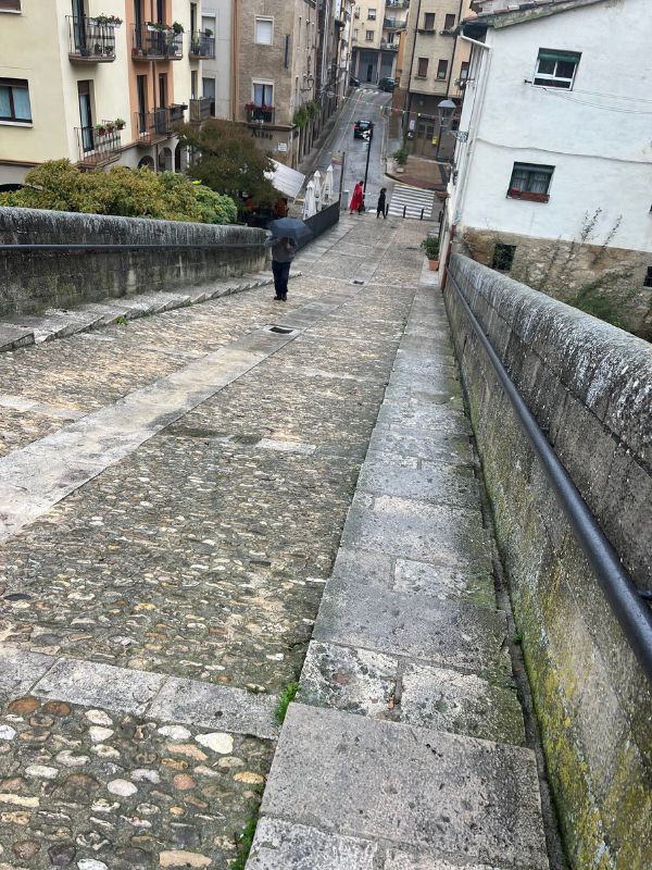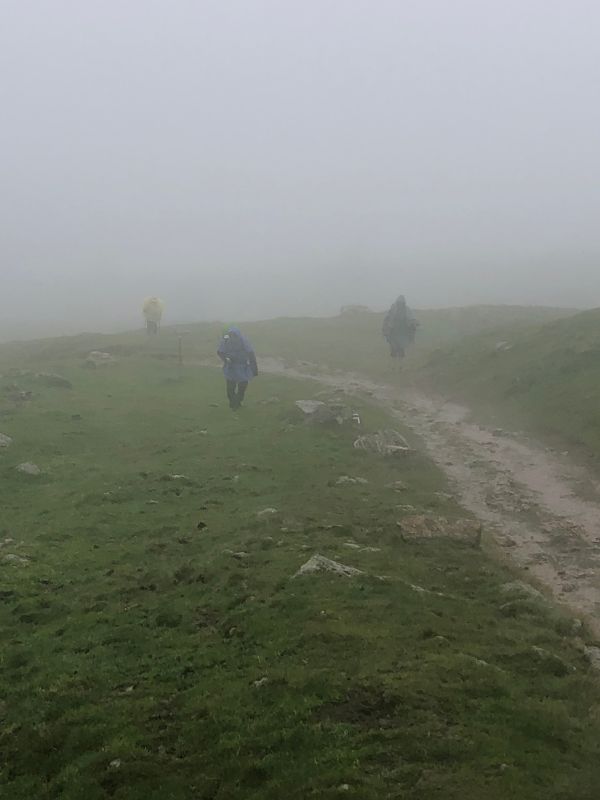 Unlike our adventurous young friend, we continue over the pass and down the steep descent into Roncesvalles, where an industrially-efficient monastery processes at least 400 of us wet tired hungry exhausted pilgrims a day. And we had it good compared to others. Jerry missed the cutoff and added 5km to her day. What’s taken us 7 hours ends up taking Roger 12 hours. What took us 27,000 steps took our short-legged Canadian friend 34,000 steps.