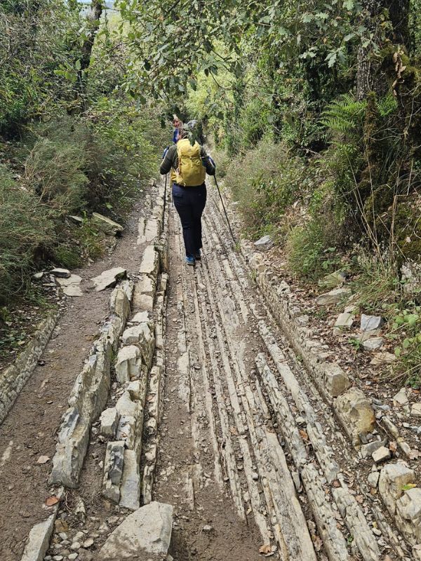 The next day my new expanded morning routine begins. Vaseline on toes and heels, bandage around pinky toe hot spot, and toe socks (think foot mittens) all to prevent chafing and blisters. Ankle cream then brace, then 2nd pair of socks. Cream on soccer-injured knee, and knee brace ready for major downhill stress. Hiking poles to take 30% of the weight. And a begrudging consent to pay $6 to have the “donkey” transport company take my backpack to the next hostel so I won’t be pounding down 28 pounds of extra weight onto that ankle.