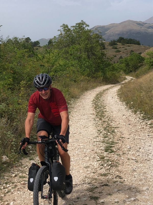 The first day of any ride is always hard as muscles and mind take time to toughen up. Leaving L’Aquila was particularly gruelling as we started up an unrelenting 8-10% grade for the first hour, then all the way back down on a bumpy gravel path, then back up to that same height again till lunchtime. The afternoon was more up, including the first ever uphill gravel grinds of my life. Here’s what the whole day, with a total of 4,214 feet of climbing, looked like (white stripes indicate gravel roads).